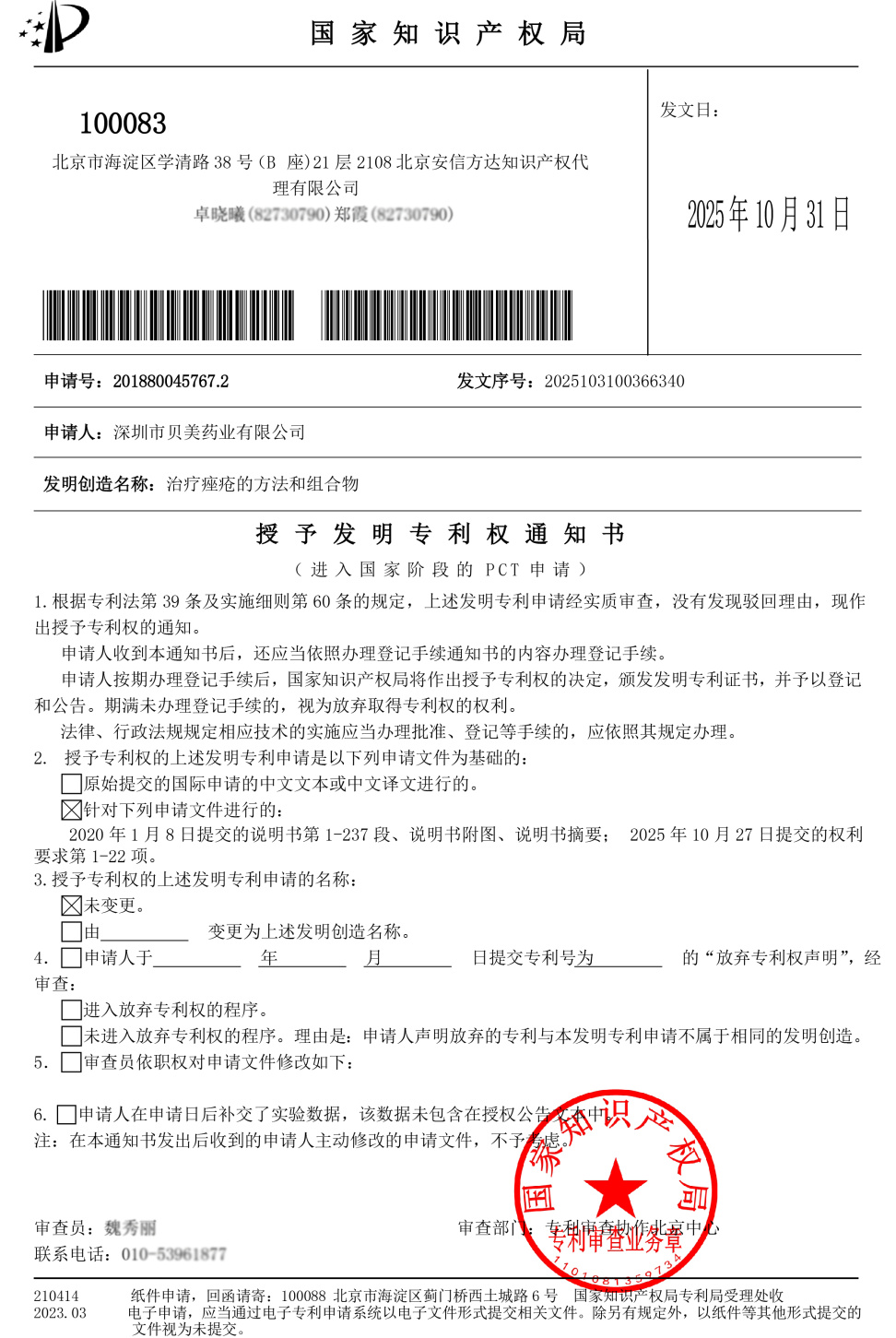近日,深圳市贝美药业有限公司的一项发明专利“治疗痤疮的方法和组合物”,成功获得国家知识产权局授予发明专利权通知书。
