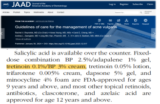 在美国皮肤病学会(AAD)2024年更新并发布的《寻常痤疮管理指南》中,对痤疮的分类、诊断、评估和治疗方案进行了全面的更新,其中TWYNEO®(唯一一款由维A酸0.1%和过氧苯甲酰3%固定剂量组合的外用乳膏)被强烈推荐用于9岁及以上痤疮患者的治疗。